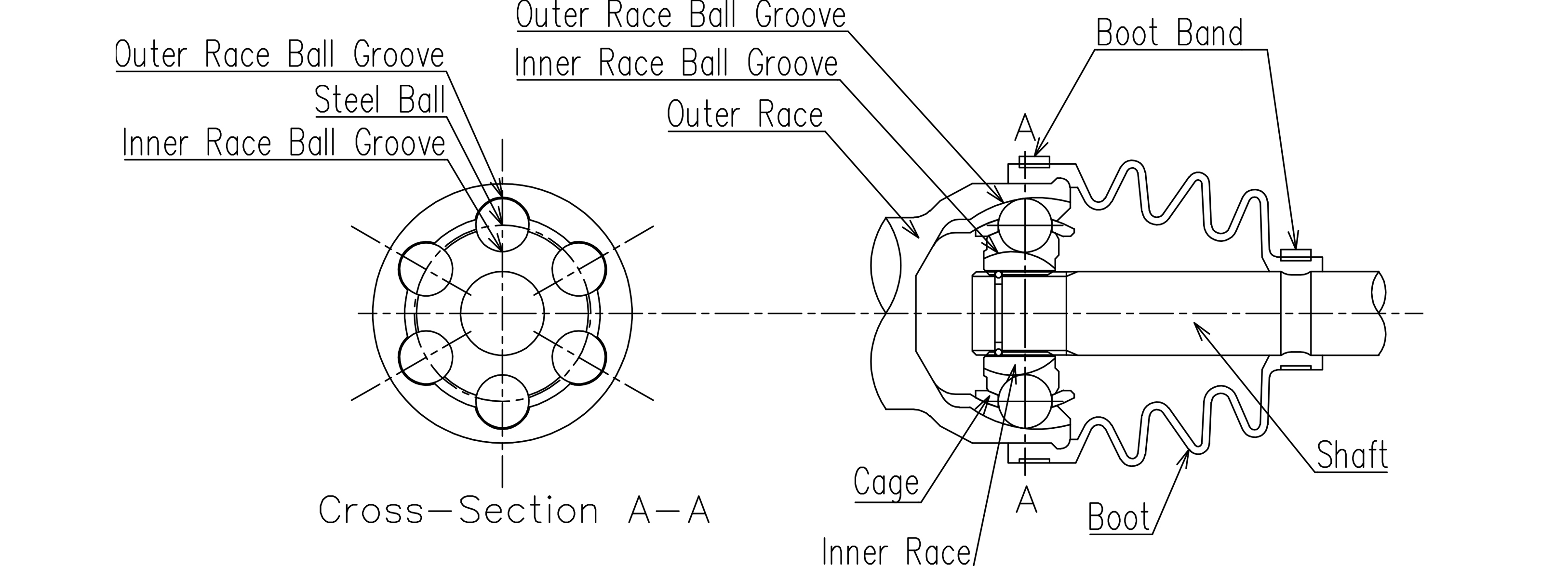 The inner side of outer race and outer side of inner race have a spherical shape, and there are 6 ball grooves each in an arc shape in the axial direction. 6 steel balls held in the cage are placed in the ball groove and transmit torque in the rotation direction.
